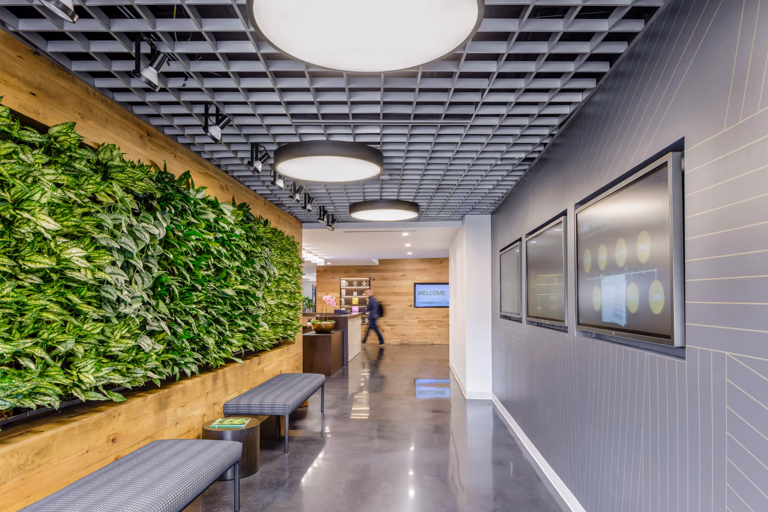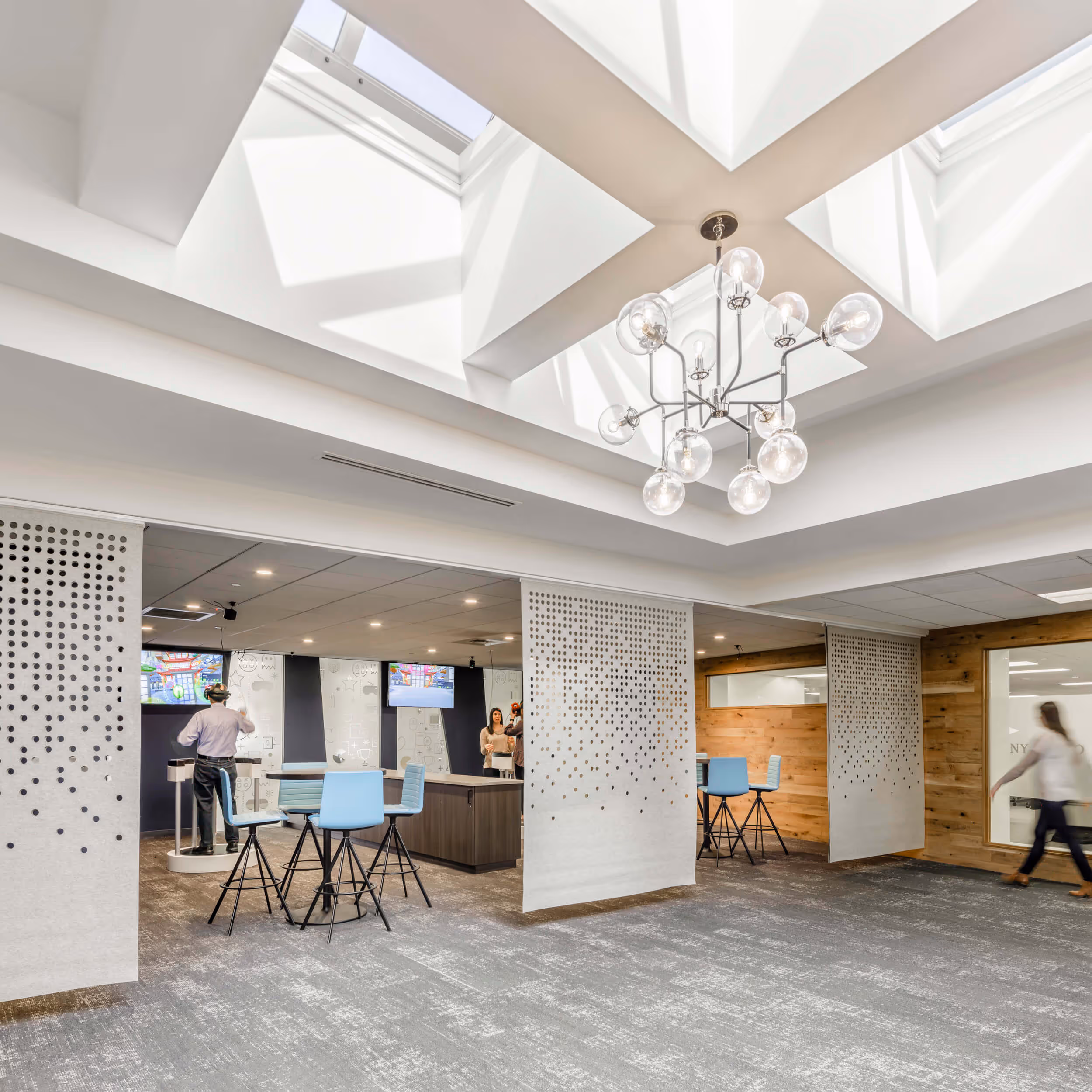 Eagle Investment Systems renovated both floors of their 100,000 square foot office space in Wellesley, Massachusetts. On the main floor, the previous tenant had constructed private offices along the entire perimeter of the building. Eagle opted to remove them all to allow for an open, collaborative and flexible work environment. 'Huddle' rooms and small privacy rooms separate the open office areas into smaller, more intimate neighborhoods. The renovation also features a large, multi-purpose cafe and lounge space, as well as a client presentation area specifically for demonstrating software capabilities. On the upper floor, a central atrium is a breakout space with a virtual reality experience lab.