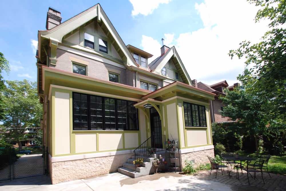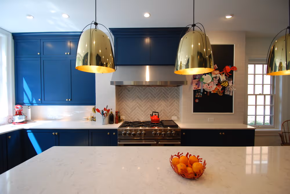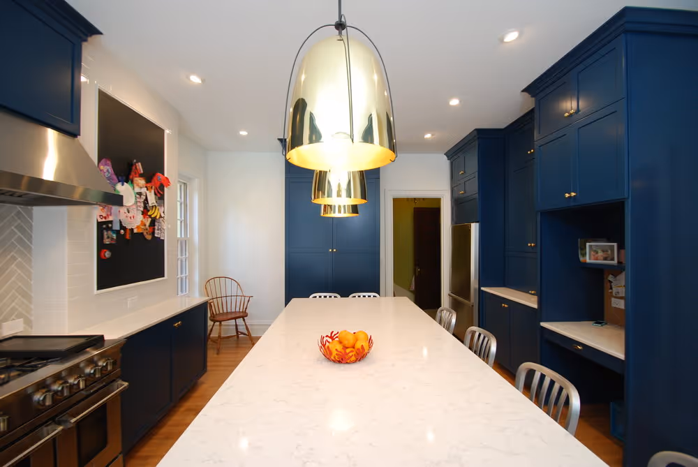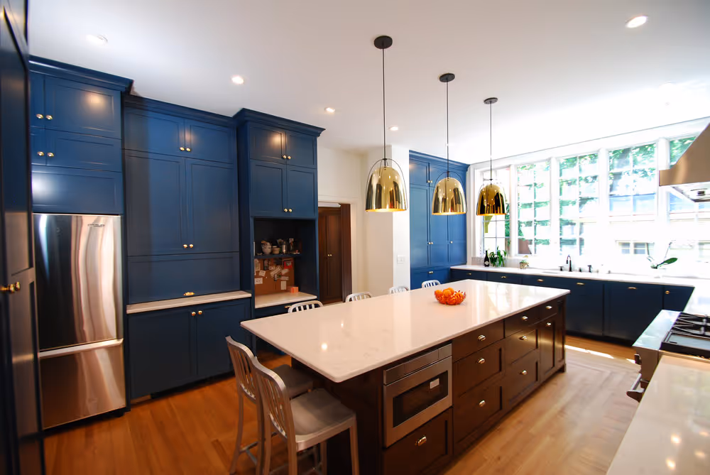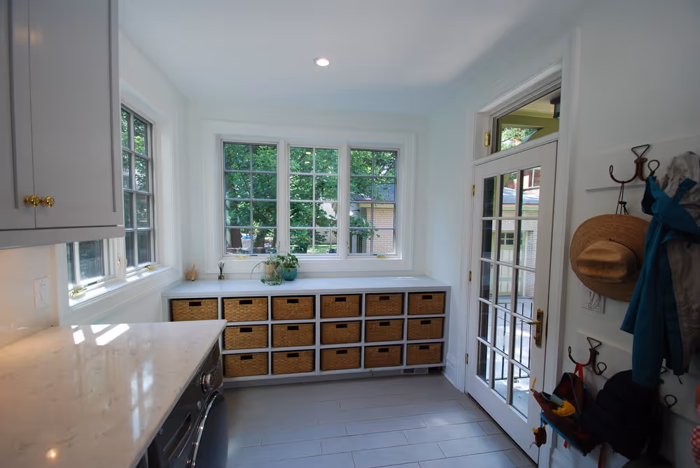 The owners of this historic Pittsburgh home wanted to enlarge and update their existing kitchen and add a laundry / mudroom entrance off the rear of the house. A new addition was constructed to tie in to the existing architecture of the home and allow for large, dramatic windows in the new kitchen. Bright blue custom fabricated cabinets in the kitchen provide ample workspace and storage, while built-in storage and seating in the mud and laundry room provide a practical transition space to the rear patio and driveway.