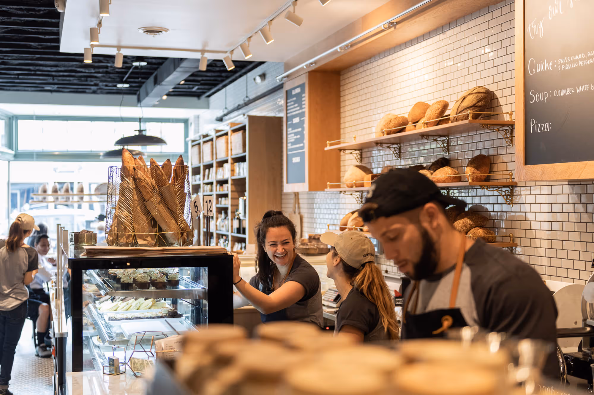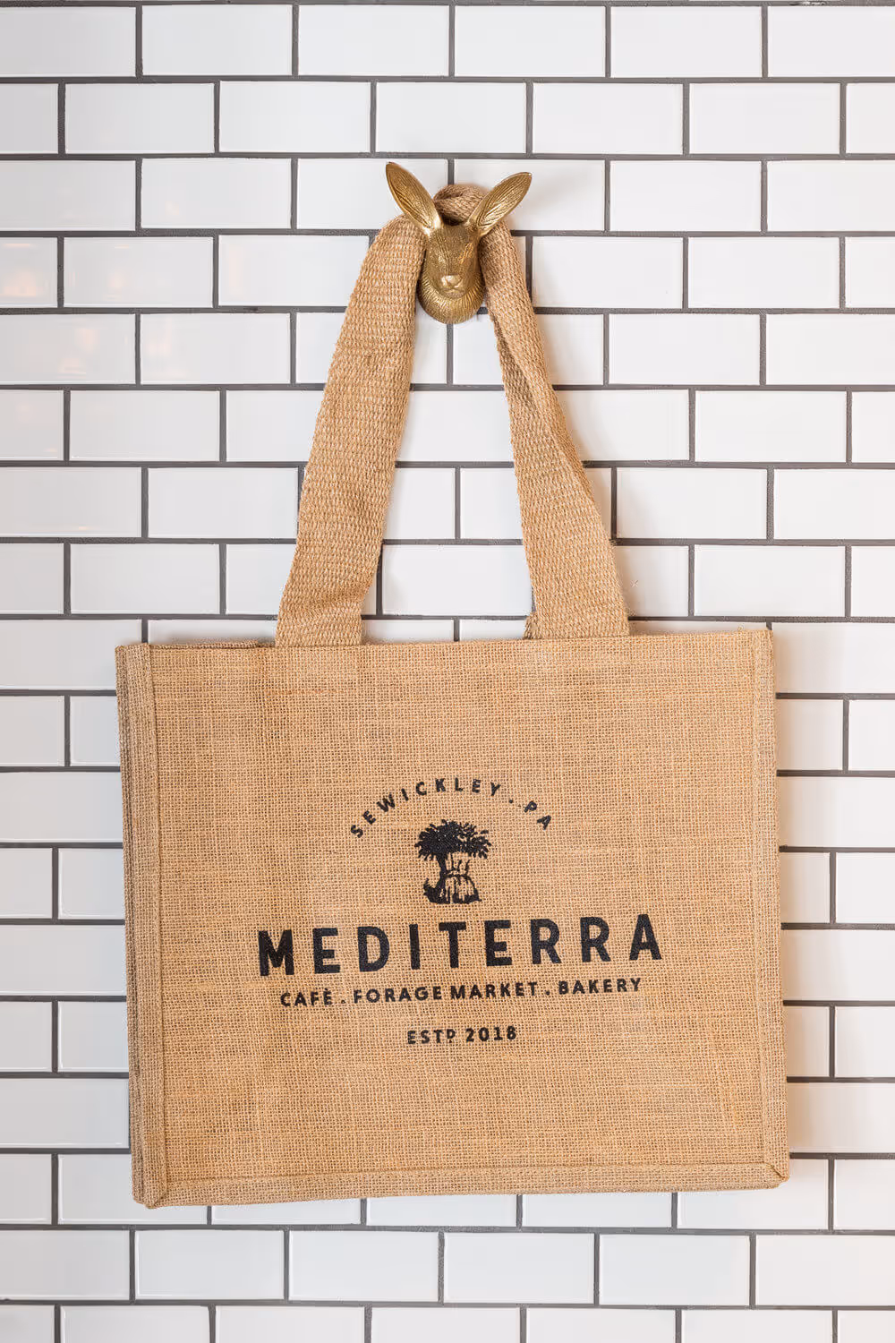 The Mediterra Café project façade renovation created a revived streetscape presence with changes that included increasing the height of the storefront with a new custom wood transom (by installing a steel beam above the original storefront), uncovering and restoring the original tin ceiling at the new stained Spanish cedar entry doors, lighter paint colors and red outdoor café furniture. A combination bakery, café, and lifestyle market, the interior offers zones which include a custom bread rack window display made from Amish harnesses, a free soda water fountain integrated into retail shelving, reclaimed wood retail and community tables, and a handwashing sink at the coffee area for customers and visiting purveyors.