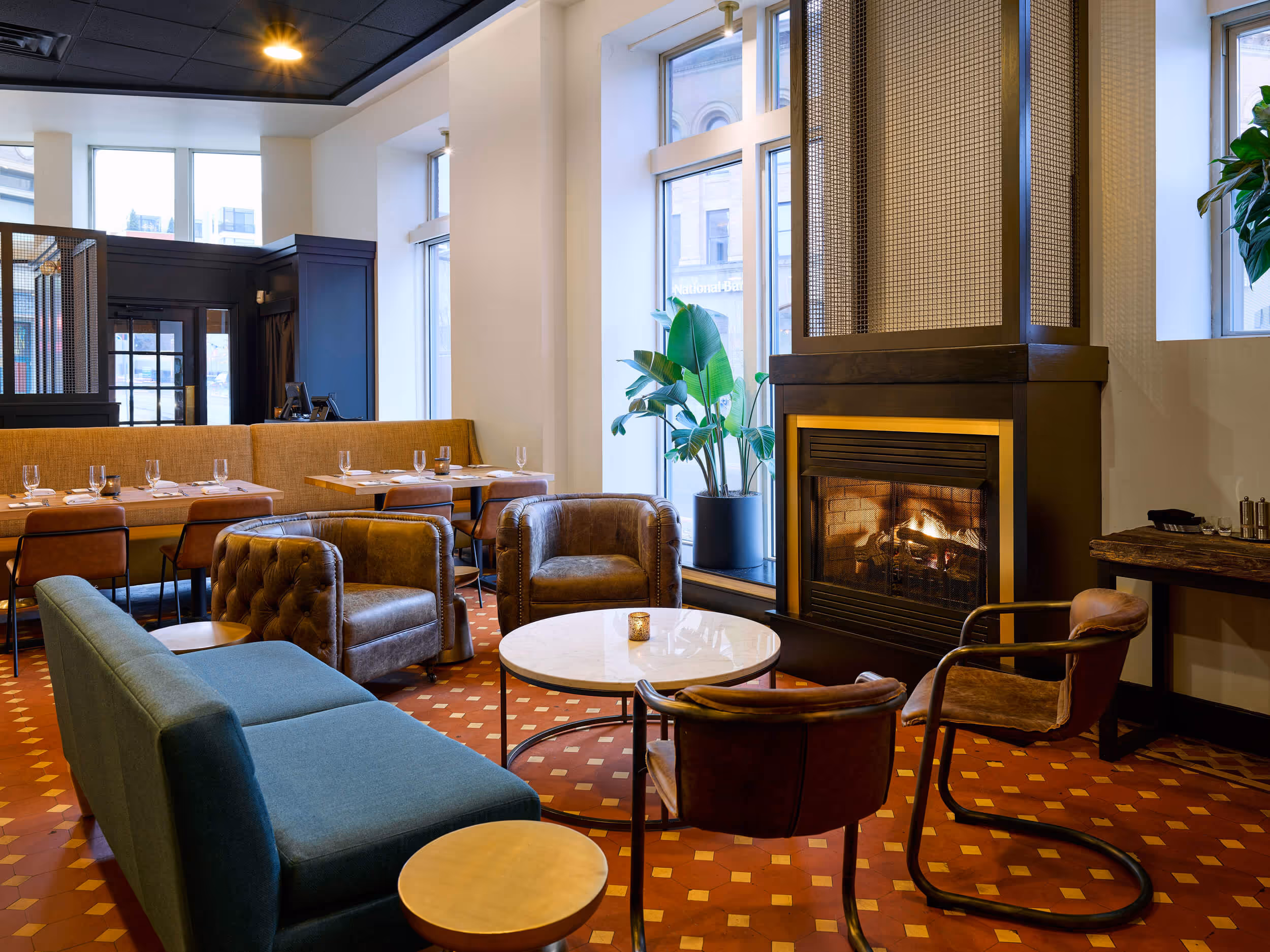 The owners of Spoon restaurant, located in an historic East Liberty building, approached Wildman Chalmers Design for a refresh of their existing dining space. New light fixtures, wallcovering, furniture and millwork components were brought in to complement the existing architectural features of the space. Playing off the existing terra cotta mosaic floor, the color scheme of the restaurant was brightened and introduced bold colors and textures. Existing heavy draperies and window awnings were removed to open up the restaurant to the street face, and a new corner blade sign was added at the corner of the building.